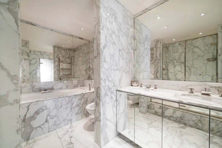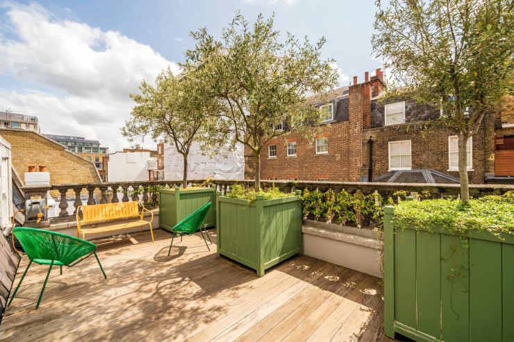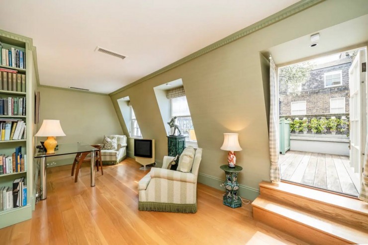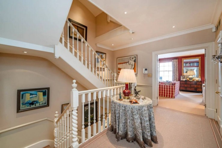 Общая площадь четырехэтажного танхауса 450 квадратных метров. Фасад выполнен в классическом английском стиле. Внутри расположено пять спален с гардеробными и ванными комнатами. Одна из них имеет выход на крышу с террасой.