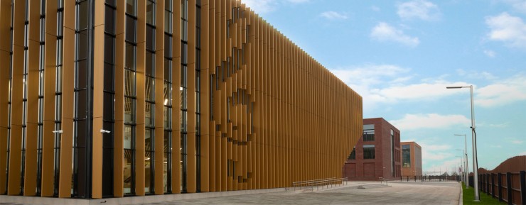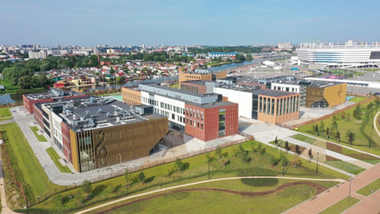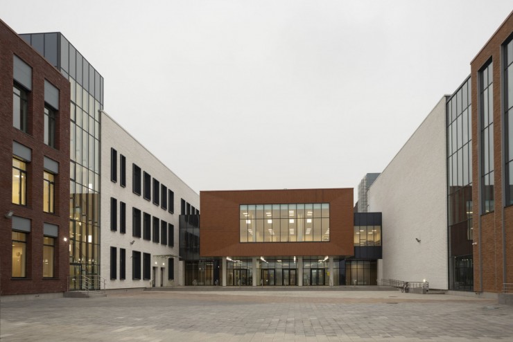 Размещенные на участке с перепадами высоты от 4 до 5 метров, кампусы комплекса имеют форму параллелепипедов, объединенных переходами, образующими внутренние дворы. Фасады зданий оформлены оконными сетками и пластическими элементами, каждый блок соответствует своему назначению: спортивный, учебный, концертный.