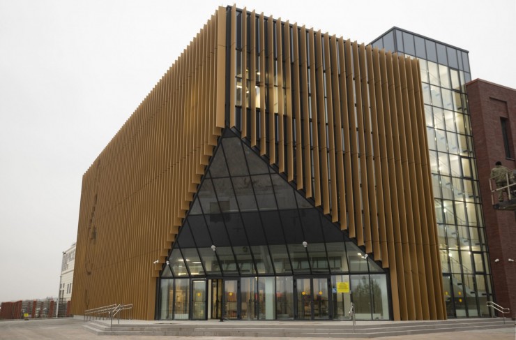 Специализированные корпуса украшены ламелями с изображениями балерин и скрипичного ключа, входы выделены остекленными фрагментами. Здания и площади между ними создают единую систему, общежития и спортивные площадки комплекса примыкают к набережной.