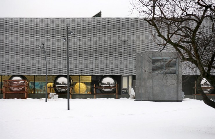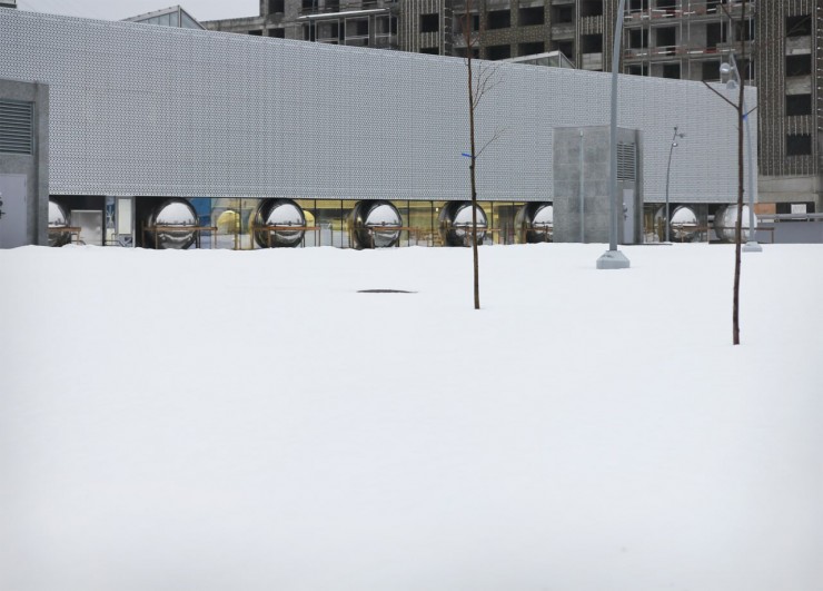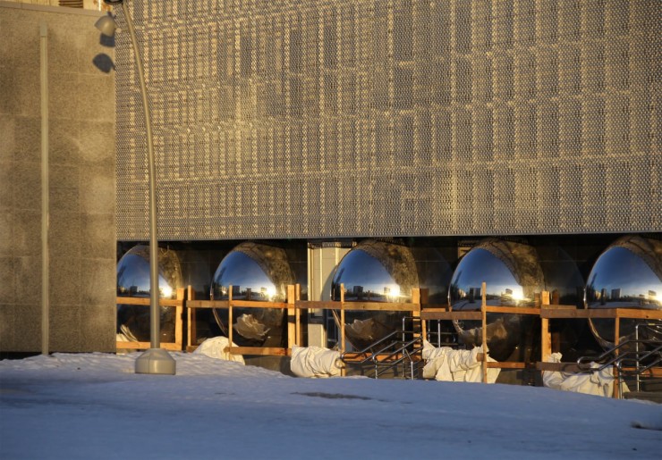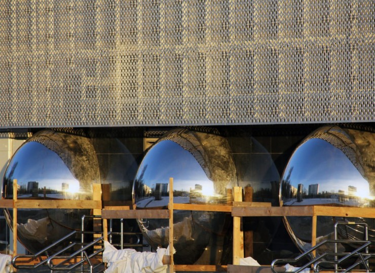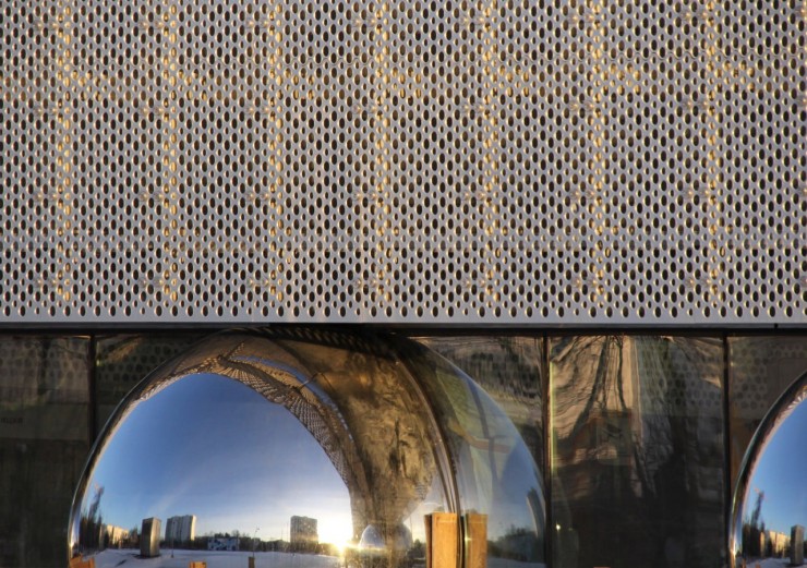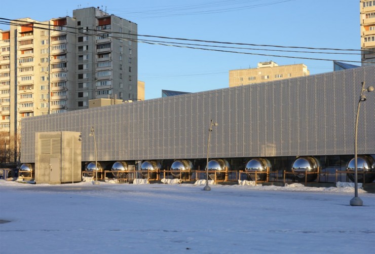 Павильон станции «Марьина роща» БКЛ окружен типовыми домами и бетонными проростками будущих зданий. Все создает весьма утопичный пейзаж, наводящий тоску. Как луч надежды, среди унылой картины пробивается новая постройка, привнося в пейзаж радость. Новогоднее настроение, витающее в воздухе, включает свою магию и позволяет взглянуть на нее иначе, чем в остальные дни года. Серебристый дырчатый параллелепипед станции метро стоит на массивных шарах из полированного металла, встроенных в теплый контур стекла. Диаметр шаров – 2,5 м, они изготовлены из нержавеющей стали 3 мм толщиной и состоят из двух половинок со стеклопакетами внутри.