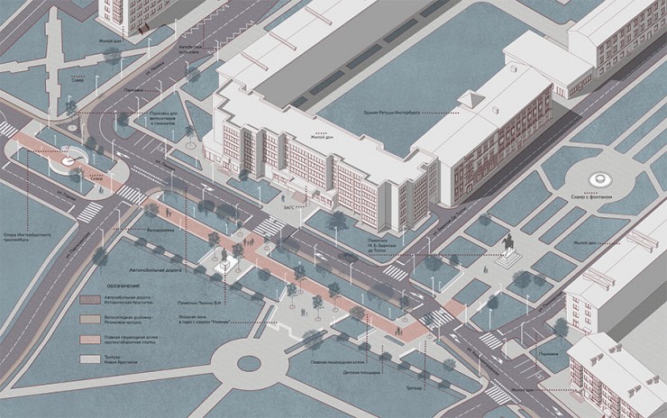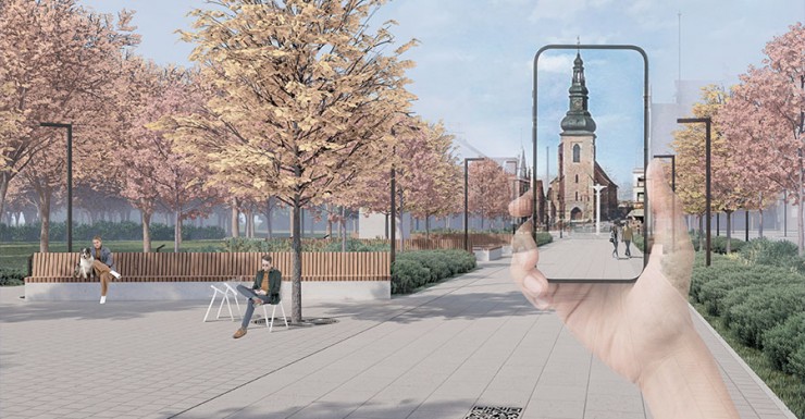 Бывшая площадь Alter Markt, является одной из двух площадей, которым отведено особое историческое внимание, уходящее корнями в прошлое, как прусского Инстербурга, так и советского послевоенного города. Проект благоустройства территории Urban AR «Связь времен», созданный Antrum Studio, включает единый исторический пешеходный маршрут между архитектурными достопримечательностями города, для прогулок по которому, планируют использовать технологию дополненной реальности. Всю протяжённость маршрута планируют реконструировать с применением МАФ, созданием систем велодорожек, озеленением и современным освещением. По пути следования, жителей и гостей города будут встречать QR-коды, ведущие на летописные справки о местности. С целью создания исторически правдивых 3D моделей было проведено архитектурное исследование местности, для воплощения использованы цифровые AR/VR технологии, через которые отражается этапность и многослойность истории. Основная идея — создать точки пересечения истории, памяти и современности. Авторы проекта Antrum Studio — архитектурная студия, работающая на российском и международном рынках в различных областях.