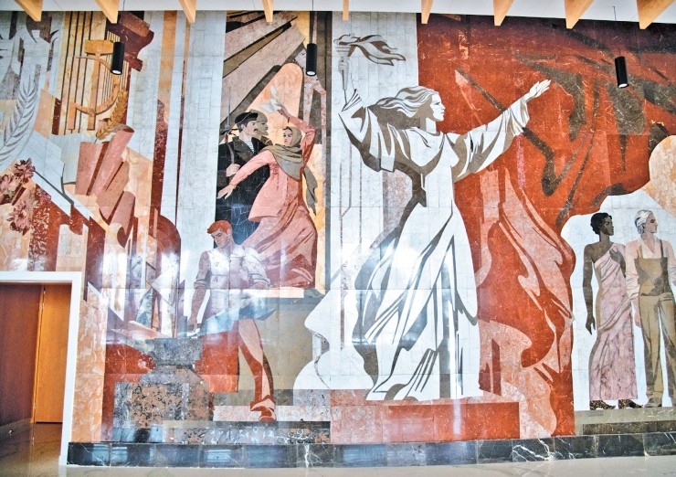 "Культура, искусство, театр". Находится: Культурный центр Олимпийской деревни (Концертный зал имени С.В. Рахманинова "Филармония-2"), фойе. Мичуринский проспект, Олимпийская деревня, 1. Автор: В.К. Замков, 1980 г. Фото: Джеймс Хилл, источник archi.ru