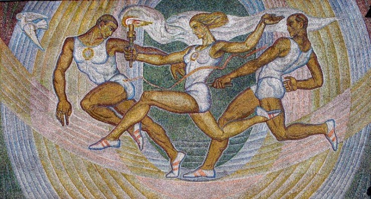 Мозаичное панно «Эстафета» (Смальта). Находится: Москва, здание бывшего Государственного центрального института физкультуры. Автор: Тутеволь К.А, 1972 г.