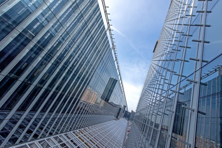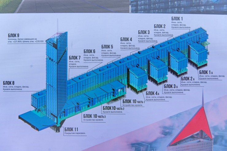 Здание имеет простые геометрические формы, фасады декорированы стеклом и тонкими алюминиевыми пластинами. Верхние части башни и вертикальные элементы освещены холодным белым светом, чтобы визуально отделить их от нижней части здания, которая будет имеет подсветку с теплым спектром.