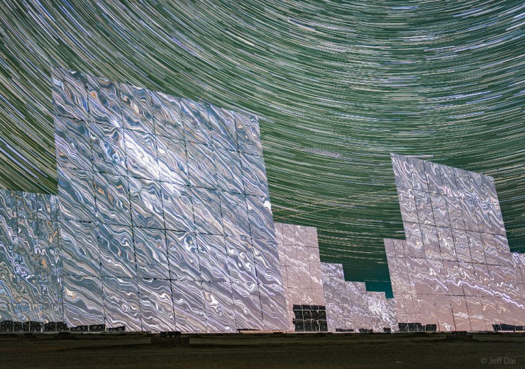 В течении дня, зеркала словно подсолнухи поворачиваются, следуя за солнцем, создавая вместе единое суперзеркало. Ночью они остаются неподвижными, тут и начинается самое впечатляющее — находясь на максимальном удалении от городской засветки, в отражении пустынных зеркал можно увидеть виды звездного неба и Млечного Пути, лишающие своей красотой дара речи.