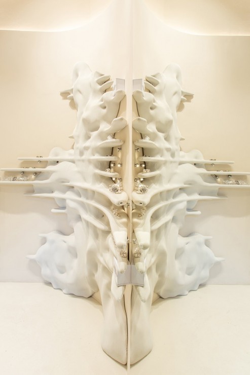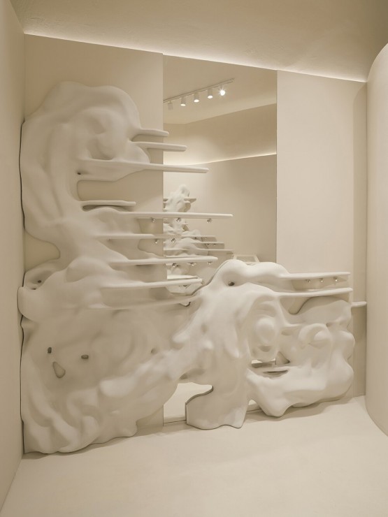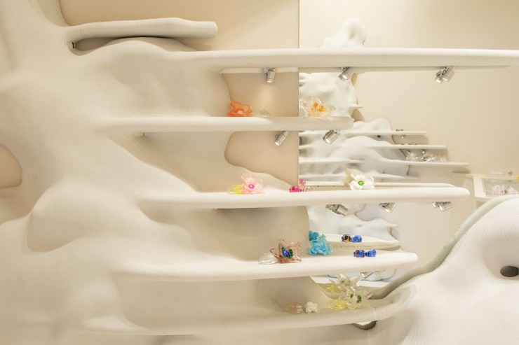 Для этого главный архитектор студии Кармело Заппулла (Carmelo Zappulla) посредством 3D-печати создал интерьер магазина как продолжение экстерьера здания. Органические формы с цветочными мотивами занимают центральное место, превращая орнаменты фасада в футуристические барельефы, расположенные на высоте от 90 до 170 сантиметров.