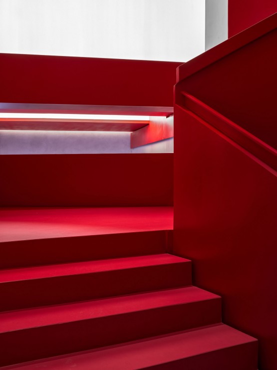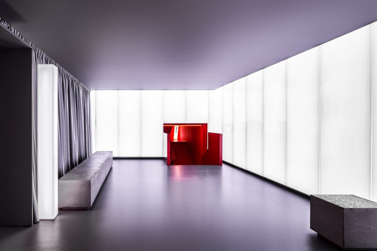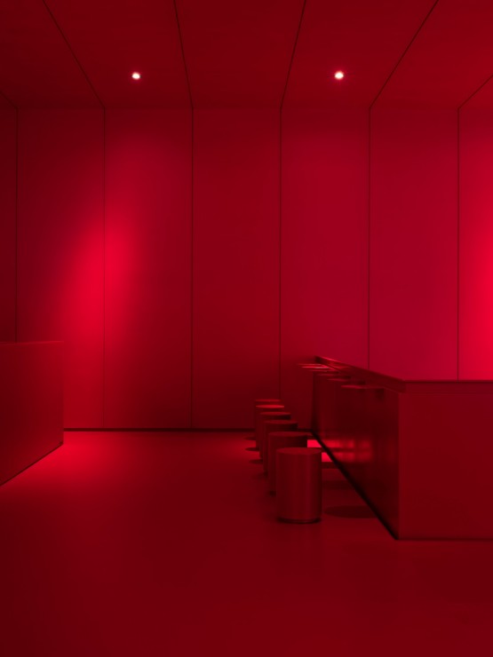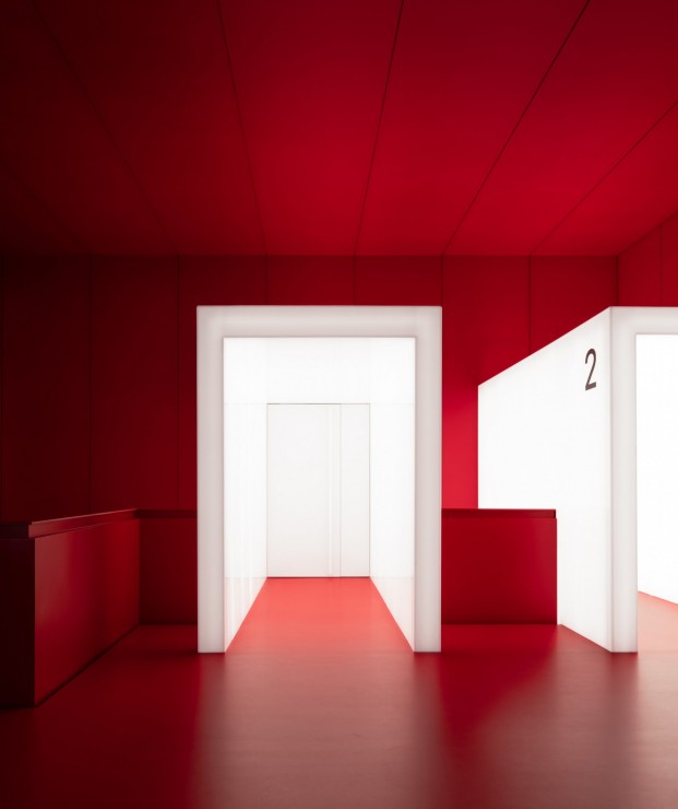 Двухэтажный холл, от которого отходят залы, был полностью переделан. Особое внимание уделили центральной лестнице, быстро ставшей точкой притяжения для проведения фотосессий. За счет игры света холл получился визуально более просторным. Здесь появились световые кубы, которые могут менять оттенок под различные задачи, включая по-киношному интригующий переход от серебряного цвета первого этажа к яркому алому на втором (красный и его оттенки — отсылка к проявочным комнатам).