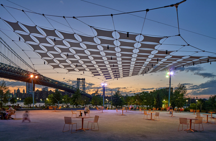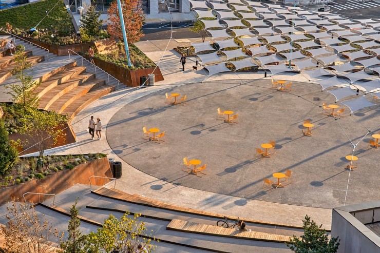 Бруклинская студия Studio Cadena сотрудничала с компанией Field Operations, чтобы создать необычное и привлекательное пространство, которое может работать круглогодично. Площадь, окруженная амфитеатром, где можно отдохнуть на парапетах или ярких мафе желтого цвета типа бар, открывает живописные виды на город. Материалы, использованные в проекте: дерево, бетон, кортеновская сталь.