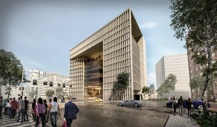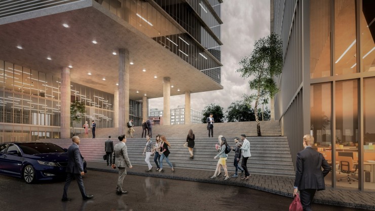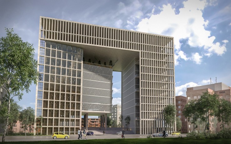 Для решения поставленной задачи, команда бюро Sthapotik, придумала идею здания с проёмом, прообразом своеобразного «окна в город». В проектном решении, под проем было использовано 50% общей площади участка, который к слову составляет 3440 кв. м. В итоге, по краям проема получилось четырнадцатиэтажное офисное здание, с размером каждого этаже около 1720 кв. м. Общая площадь застройки 24 000 кв.м.