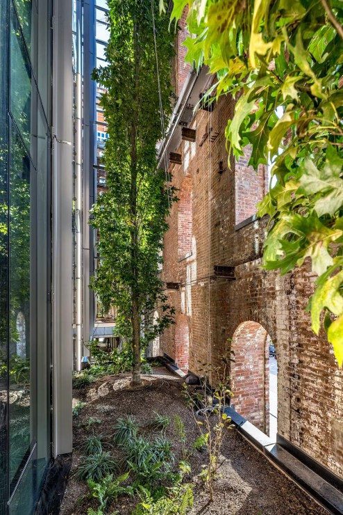 Один из ключевых аспектов проекта – 12-футовый зазор между новым и старым зданиями, который стал домом для дендропарка компании Field Operations. Здесь высажено 17 деревьев, зазор помогает создать гармоничное переплетение между этажами здания и обеспечить проникновение естественного света внутрь офисных помещений.