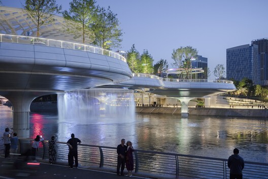 Мост поделен на девять зон выполненных в форме дисков. Они не только образуют единую конструкцию, но и предлагают жителям девять различных видов деятельности. Водный бар под павильоном из листьев лотоса позволяет наслаждаться пейзажами, круглосуточная библиотека самообслуживания предоставляет место для чтения жителям близлежащих домов. Круговой театр, построенный в соответствии с высотой берегов реки, является местом проведения представлений на открытом воздухе. Фантастическое водное шоу с фонтанами создает яркие впечатления для взрослых и детей. Средняя часть настила моста выполнена в виде кольца, что создает идеальное место для прогулок над водой. На мосту установлены 46 беседок, которые расположены в соответствии с требованиями к нагрузке на конструкцию.