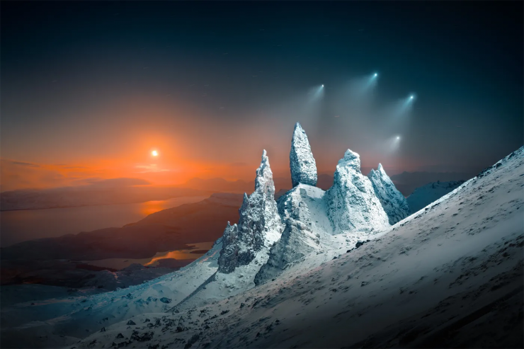 Номинация «Пейзаж», где запечатлен момент восхода Луны и несколько беспилотных летательных аппаратов над холмом Сторр на острове Скай, Шотландия. Снимок был сделан во время снежной бури. Автор Liam Man.