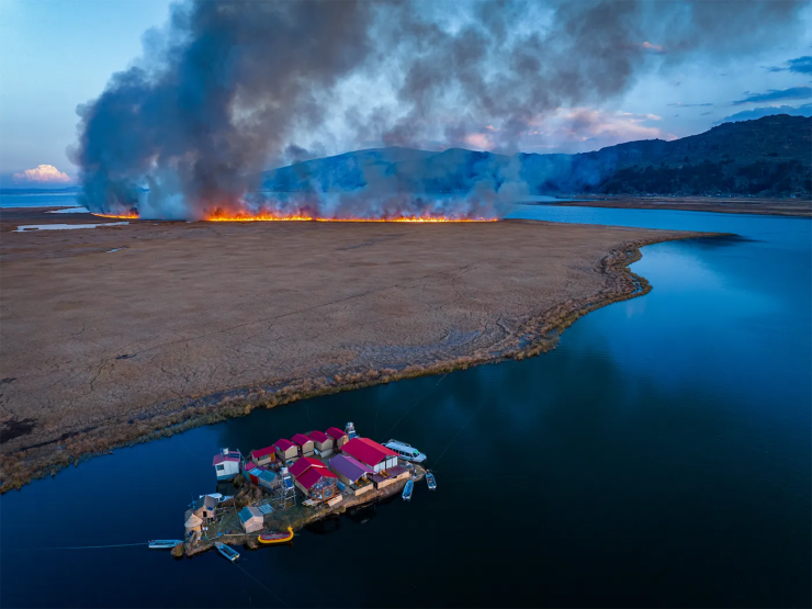 «Между спокойствием и катастрофой» — победитель в номинации «Путешествие» с изображением плавучей деревни на берегу озера Титикака, на фоне приближающегося лесного пожара. Автор Yan Li.