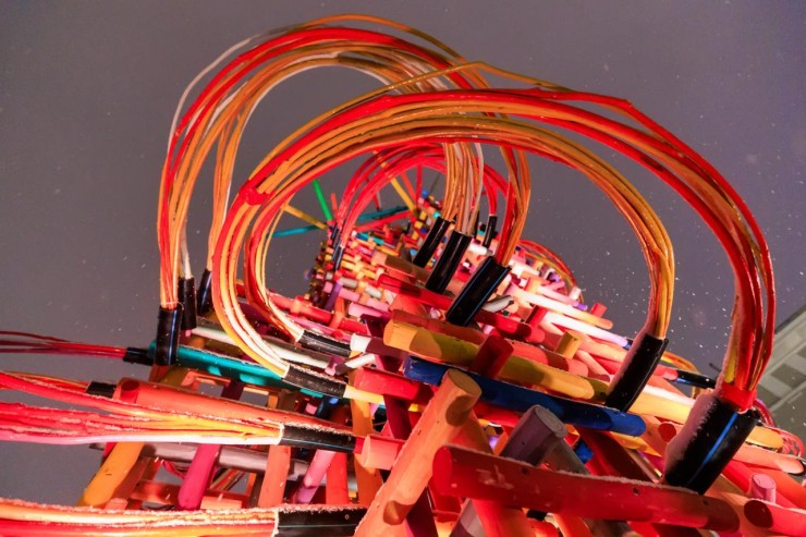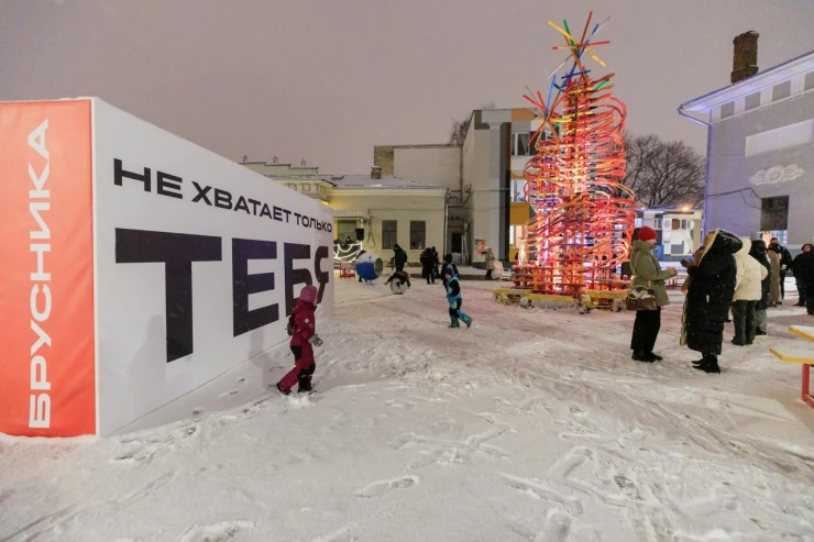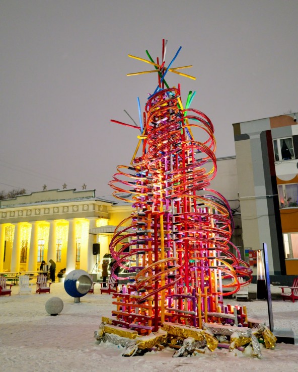 Вчера во дворе Музея Москвы состоялось открытие праздничного общественного пространства созданного девелоперской компанией Брусника и Бюро Никола-Ленивец. Главным объектом новогодней площади стала шестиметровая «Электрическая елка», спроектированная художником Николаем Полисским.