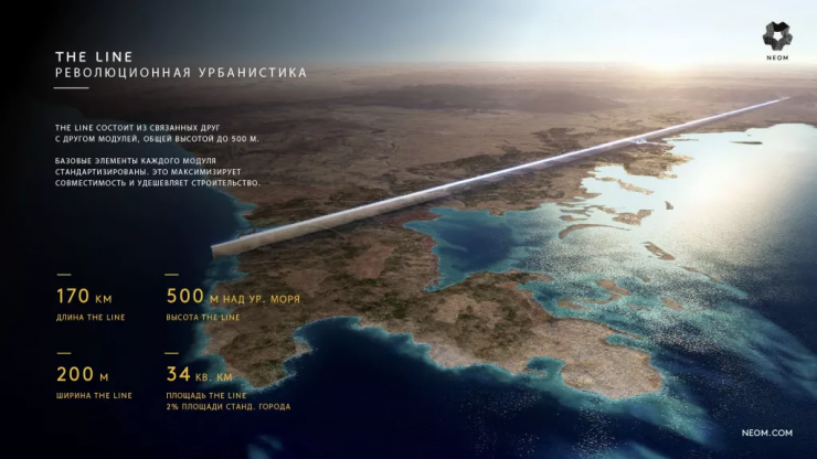 Прошлым летом Саудовская Аравия озвучила амбициозные планы о строительстве самого футуристического город на планете — The Line. Который будет представлять собой беспрерывную линию из зеркала длиною 170 км. Ширина города составит всего 200 метров, при общей высоте строения 500 метров.