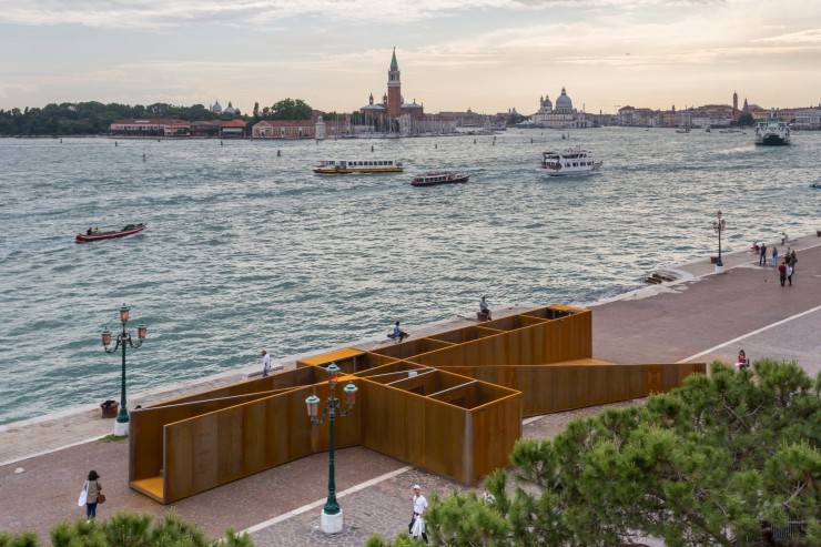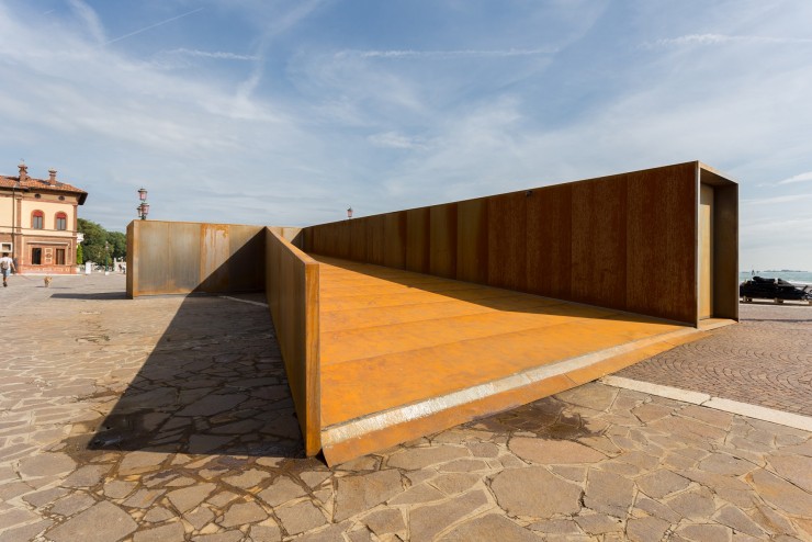 Тогда инсталляция находилась вне зоны павильонов биеннале, и располагалась на набережной, поскольку имела немалый размер. Конструкция, посвященная падению Икара, состояла из нескольких связанных между собой архитектурных пространств, включающих в себя семь комнат и была выполнена из кортеновской стали, как символ связи с портом.