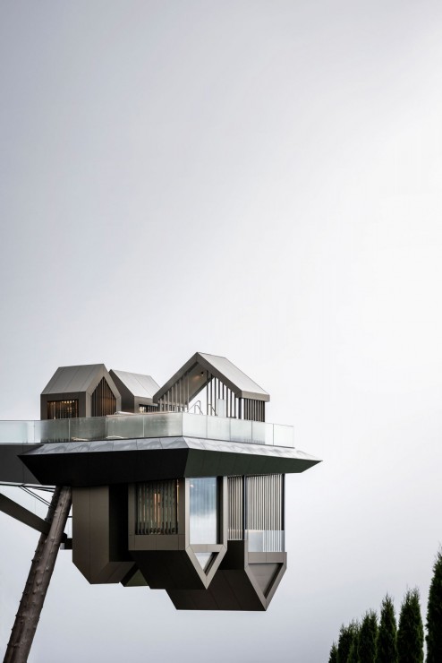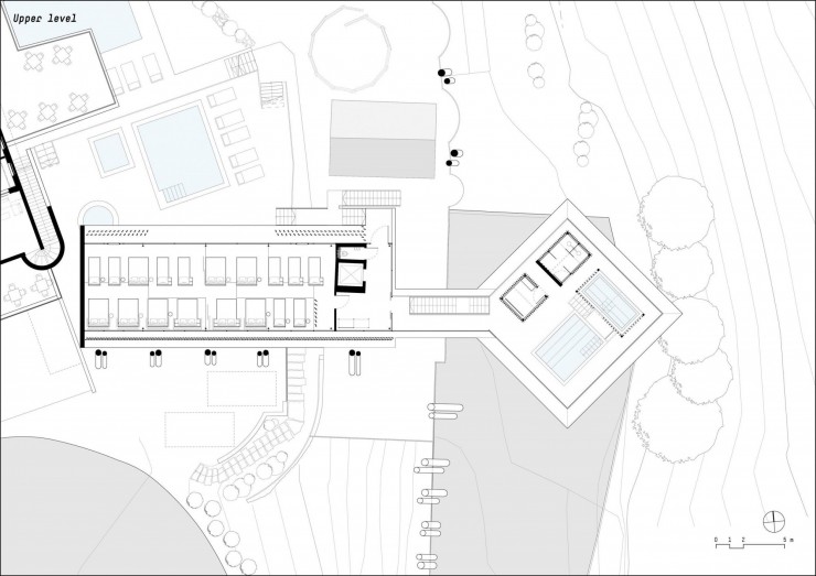 Новый корпус расположен с юго-восточной стороны отеля, симметрично бассейну. По аналогии с которым, он отделен от основного здания. Платформа парит на высоте 15 метров над землей и опирается на два столба, обшитых лиственничными бревнами. Посетители попадают в оздоровительную зону по подвесному мосту. Внутри на двух уровнях разместились разнообразные спа-пространства. Благодаря двускатным крышам, находясь на нижнем уровне, гость видит горизонт перевернутым на 180°, а хижины кажутся парящими вверх ногами.