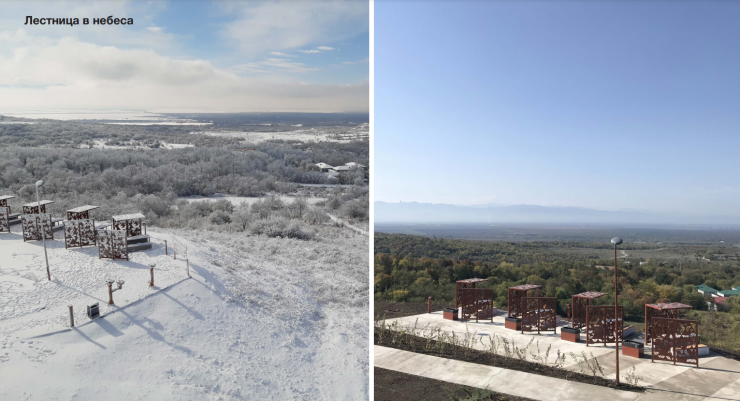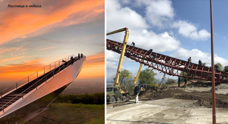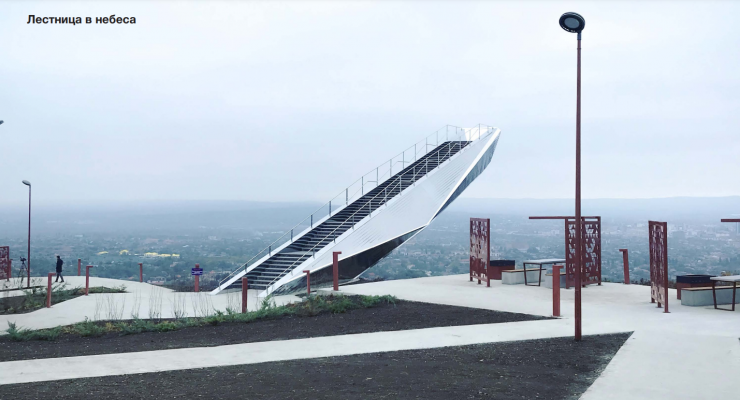 На окраине Грозного построили новую смотровую площадку в виде лестницы с выносной консолью протяжённостью более 30 метров. Авторы проекта, бюро NX Architects. Конструкция закреплена к бетонному основанию и покрыта зеркальной сталью, благодаря чему идеально вливается в окружающий пейзаж. Рядом расположены зона отдыха с беседками грилем. Новая точка, быстро стала популярным местом отдыха местных жителей.