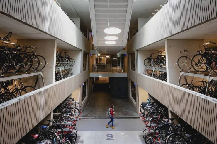 Красные и зеленые огни на колоннах внутри гаража показывают, в каких рядах стоек есть свободные места. Эскалатор расположенный в конце гаража обеспечивает прямой доступ к центральному вокзалу Амстердама.